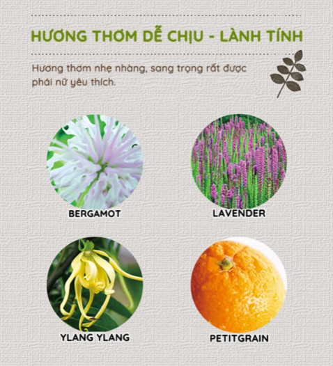 ✔ Hương thơm nhẹ nhàng, sang trọng từ những chiết xuất thiên nhiên, giúp thư giãn tinh thần sau ngày làm việc, học tập căng thẳng, mệt mỏi.