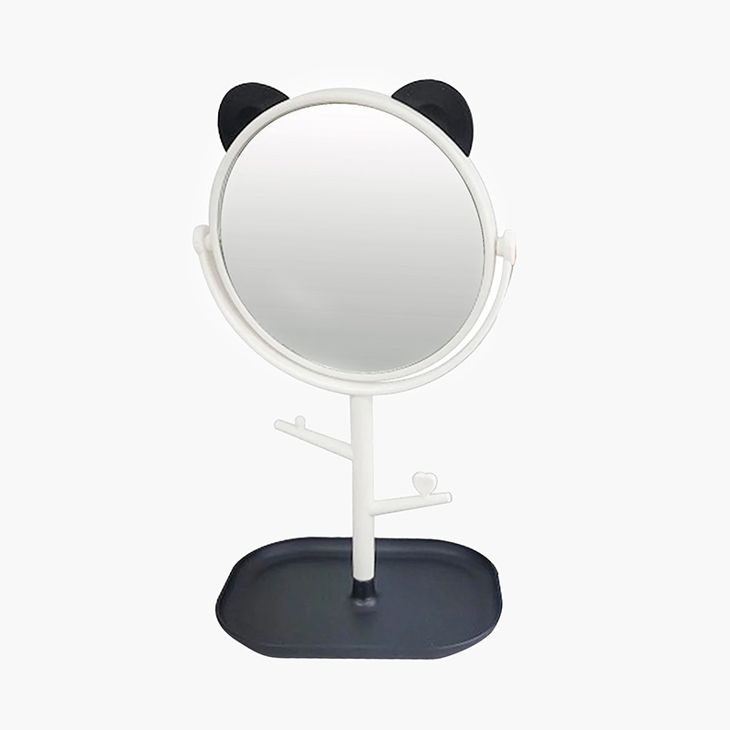 Gương soi có đường kính 14cm, có thể điều chỉnh xoay nhiều góc độ tiện dụng. Thiết kế hình gấu trúc độc đáo, kèm khay đựng và móc treo phụ kiện như cột tóc, bông tai, kẹp tóc, trang sức…