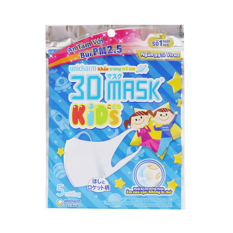 | Tên sản phẩm | Khẩu trang cho bé Unicharm Nhật Bản 3D Mask Kids chống bụi mịn PM2.5 99% (5 cái) |