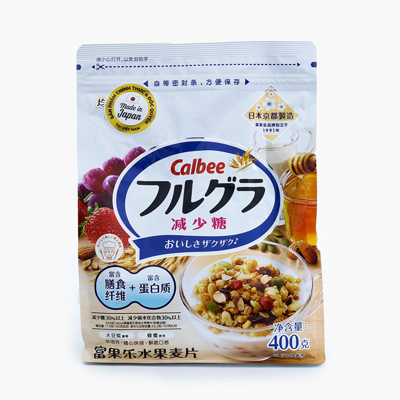 Ngũ cốc trái cây giảm 30% đường so với sản phẩm nguyên bản, tốt hơn cho sức khỏe. Được kết hợp từ các hạt ngũ cốc như yến mạch, gạo lứt, lúa mạch đen, hạnh nhân, hạt bí, kết hợp cùng các loại trái cây như dâu, nho, dừa, đậu nành, protein đậu nành, mang hương vị độc đáo. Ngũ cốc giòn tan, vị hấp dẫn, ngon miệng. Rất giàu chất xơ và protein cần thiết cho cơ thể mỗi ngày.. Có thể ăn liền trực tiếp hoặc kết hợp ăn với sữa chua, sữa tươi, rất tốt cho sức khỏe. Đem đến những bữa ăn sáng hoặc ăn phụ bổ dưỡng, lành mạnh.