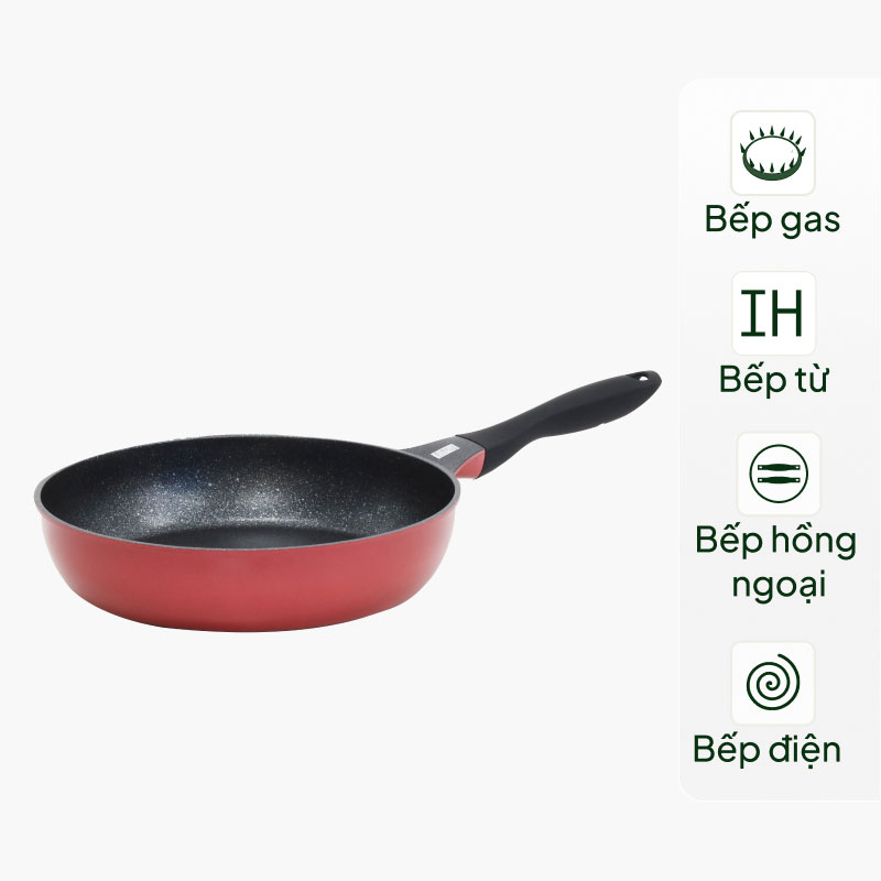Chảo được làm bằng chất liệu nhôm đúc cứng chắc, khó biến dạng. Chảo được phủ 3 lớp với bề mặt được phủ lớp flo đá hoa cương, đã được kiểm chứng khả năng chống lại 1 triệu lần mài mòn, chống bám dính thức ăn, chống trầy xước hiệu quả, giúp tiết kiệm dầu ăn khi nấu nướng và dễ dàng chùi rửa. Có thể dùng sạn kim loại. Thích hợp dùng cho mọi loại bếp (gas, điện từ, hồng ngoại, bếp điện…).