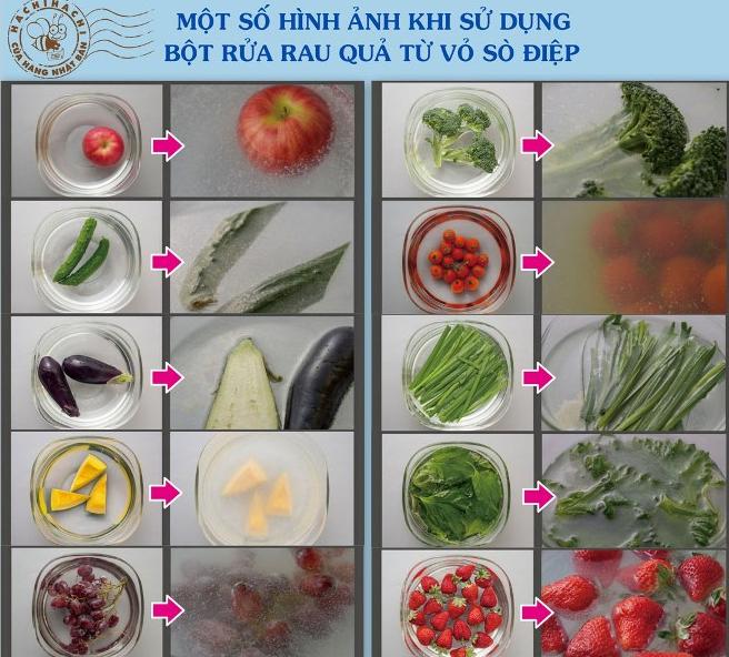 ♦ Rửa và khử trùng cho rau củ quả: Cho khoảng 3g (1 muỗng café) bột sò điệp vào 2 lít nước, khuấy đều hòa tan. Cho rau củ quả vào, ngâm khoảng 5 ~ 10 phút, khi đó chất bẩn sẽ bị hòa tan, dung dịch sẽ vẫn đục và có lớp váng dầu nổi lên hoặc nước đổi màu (có thể kiểm chứng bằng mắt). Sau đó, rửa thật sạch lại với nước. Có thể để rau củ ráo nước và bảo quản (lớp bột trắng có thể sẽ bám lại trên rau củ), trước khi lấy ra ăn, nên rửa lại với nước.