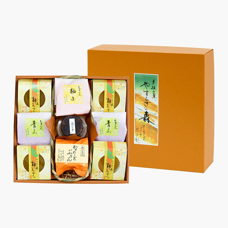 Hộp gồm 5 vị thạch hấp dẫn: Thạch đậu đỏ x 1, thạch Youkan quả hồng x 4, thạch thanh yên Yuzu x 1, thạch quả mơ xanh x 2, thạch pudding vị kem Custard x 1