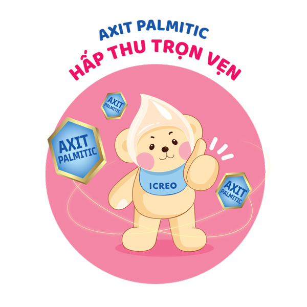 | Hướng dẫn sử dụng | Sữa Icreo Follow Up Milk hỗ trợ sự phát triển thật khỏe mạnh của bé, giải quyết mối lo lắng về dinh dưỡng trong các bữa ăn dặm. Cung cấp 5 loại nucleotide không thể thiếu trong quá trình phát triển của trẻ. Tác dụng thúc đẩy tăng trưởng, tăng cường miễn dịch, tăng vi khuẩn đường ruột có lợi, cải thiện chuyển hóa lipid, gia tăng nhiệt lượng và phát triển ruột, tăng cường hấp thụ chất sắt. Cung cấp chất sắt cần thiết trong giai đoạn phát triển của bé và vitamin D là loại vitamin khó hấp thụ từ các bữa ăn dặm. Tăng cường khoáng chất cần thiết cho sự trưởng thành. Cân bằng chất béo gần với sữa mẹ. Hơn nữa, do sử dụng dầu tía tô có nhiều α- axit linolenic (ALA), tỉ lệ axit béo được điểu chỉnh gần giống như sữa mẹ. HDSD: Pha 1 gói sữa bột với 100ml nước. |