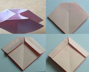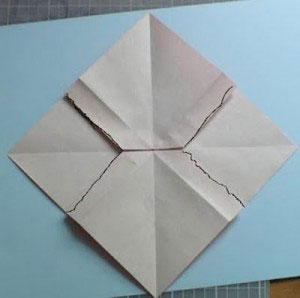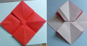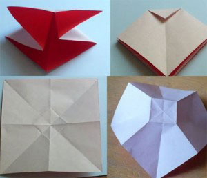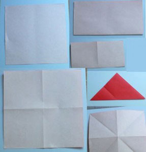 ![]() | Dùng kéo cắt giấy màu thành hình vuông Gấp đôi theo chiều dọc và chiều ngang Tiếp theo gấp 2 đường chéo của hình vuông |