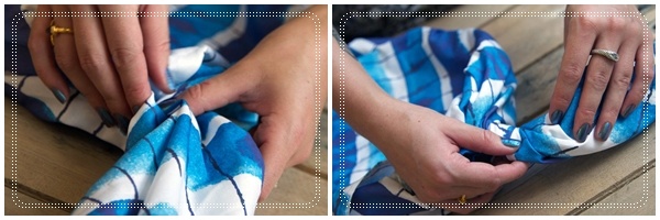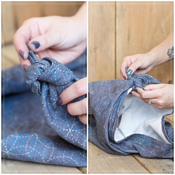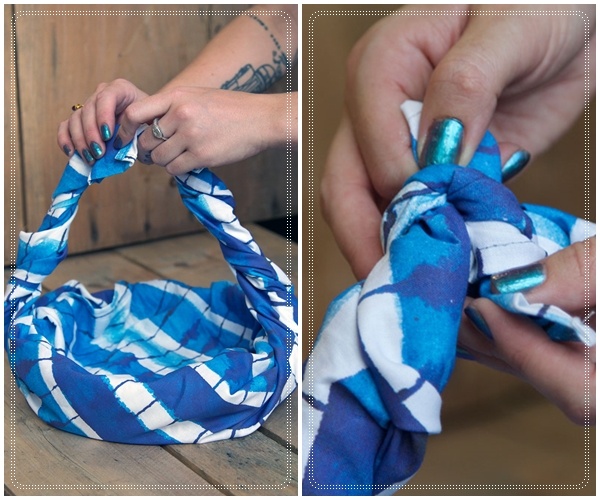 Bước 2: Buộc hai góc vải đối nhau để tạo thành nút buộc đầu tiên. Tiếp tục buộc túm hai góc vải còn lại.